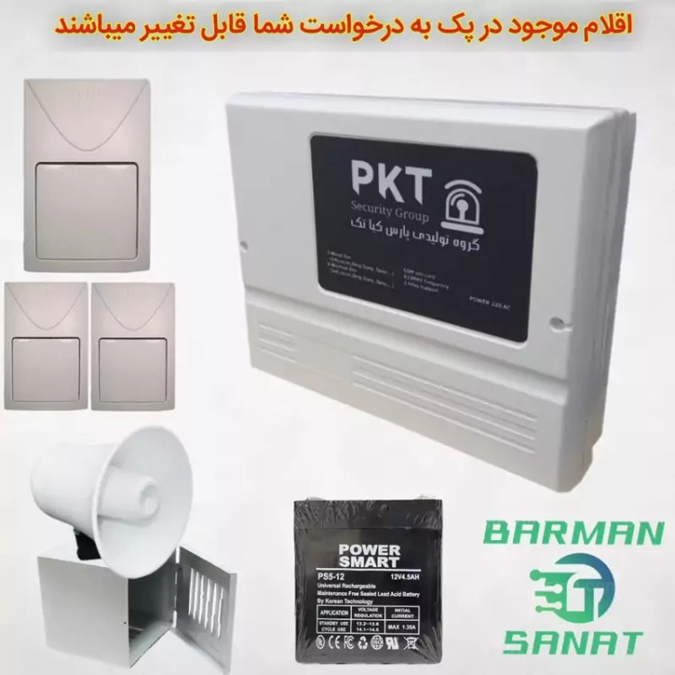 بهترین محصول، بهترین انتخاب پک کامل دزدگیر اماکن سیم کارتی برند معتبر و درجه یک PKT اقلام داخل پک: یک پنل دزدگیر مدل بدون کیپد سه عدد سنسور چشمی فوتال (برد تا 8 متر) یک عدد باتری 4.5 آمپر درجه یک یک عدد بلندگو 30 وات یک عدد کاور یا قاب بلندگو فلزی درب دار معرفی دزدگیر PKT اولین دزدگیر بدون صفحه کلید و نمایش در ایران از سری محصولات اقتصادی برند PKT می باشد و دارای آنتن تقویت کننده می باشد . مناسب جهت نصب در کلیه اماکن مسکونی و فروشگاه ها و باغ ویلا ها می باشد. اولین دزدگیر بدون صفحه کلید و نمایش در ایران پشتیبانی همزمان از خط تلفن و سیم کارت دارای دو سال گارانتی و 5 سال خدمات پس از فروش دارای چهار زون سیمی و نه زون بی سیم دارای دیپ سوئیچ برای اتصال کوتاه زونها دارای LED چشمک زن برای تشخیص سیمکارت پشتیبانی از تمام اپراتورها کنترل کردن دستگاه به چهار روش تماس ، پیامک ، نرمافزار و ریموت تنظیم چهار سطح امنیتی A B C D برای مخاطبین تعریف پنج حالت مختلف برای هر زون قابلیت حذف ریموت از طریق پیامک ونرمافزار قابلیت تنظیم زبان فارسی و انگلیسی بررسی قدرت سیگنال دهی دستگاه قابلیت شنود صدای محیط قابلیت تغییر مدت زمان آژیر پشتیبانی از فرکانس 433 داری دو عدد رله جهت کنترل وسایل برقی