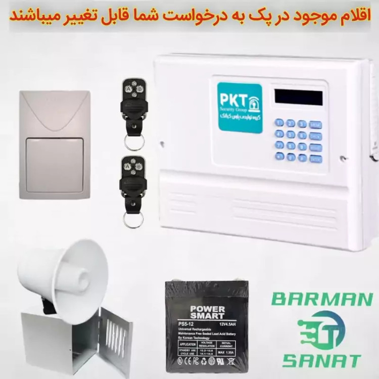 بهترین محصول، بهترین انتخاب پک کامل دزدگیر اماکن سیم کارتی برند معتبر و درجه یک PKT مدل دارای کیپد و نمایشگر اقلام داخل پک: یک پنل دزدگیر به همراه دو عدد ریموت یک عدد سنسور چشمی فوتال (برد تا 8 متر) یک عدد باتری 4.5 آمپر درجه یک یک عدد بلندگو 30 وات یک عدد کاور یا قاب بلندگو فلزی درب دار معرفی دزدگیر PKT اولین دزدگیر به همراه کیپد و نمایشگر در ایران از سری محصولات اقتصادی برند PKT می باشد و دارای آنتن تقویت کننده می باشد . مناسب جهت نصب در کلیه اماکن مسکونی و فروشگاه ها و باغ ویلا ها می باشد. اولین دزدگیر بدون صفحه کلید و نمایش در ایران پشتیبانی همزمان از خط تلفن و سیم کارت دارای دو سال گارانتی و 5 سال خدمات پس از فروش دارای چهار زون سیمی و نه زون بی سیم دارای دیپ سوئیچ برای اتصال کوتاه زونها دارای LED چشمک زن برای تشخیص سیمکارت پشتیبانی از تمام اپراتورها کنترل کردن دستگاه به چهار روش تماس ، پیامک ، نرمافزار و ریموت تنظیم چهار سطح امنیتی A B C D برای مخاطبین تعریف پنج حالت مختلف برای هر زون قابلیت حذف ریموت از طریق پیامک ونرمافزار قابلیت تنظیم زبان فارسی و انگلیسی بررسی قدرت سیگنال دهی دستگاه قابلیت شنود صدای محیط قابلیت تغییر مدت زمان آژیر پشتیبانی از فرکانس 433 داری دو عدد رله جهت کنترل وسایل برقی